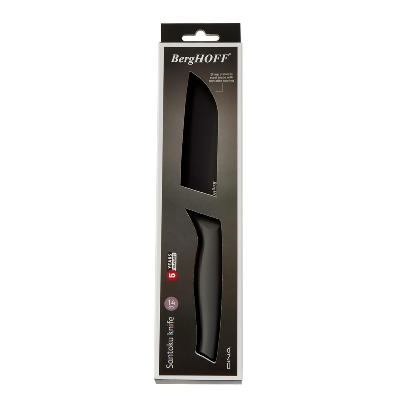 - Stainless steel 5.5" Santoku knife with nonstick ceramic coating and ergonomic PP handle. Includes PP protective sleeve.