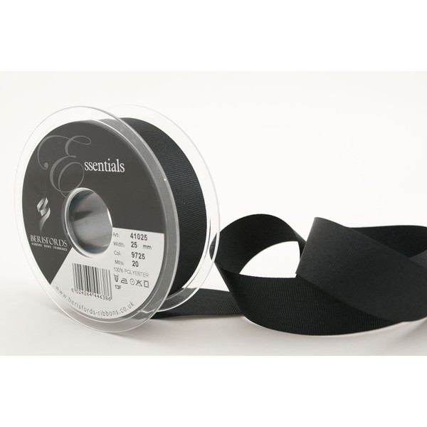 Berisfords 41025 20 m x 25 mm Polyester Grosgrain Ribbon, Black