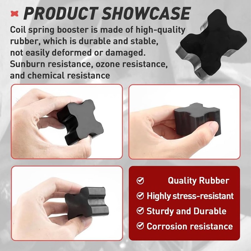 - IMPROVE VEHICLE PERFORMANCE The coil spring spacer kit includes 8 rubber spacers, designed to raise and support sagging coil springs. Each 1.5 inch thick spacer provides accurate lifting options, effectively restoring spring tension to improve vehicle stability and driving comfort.