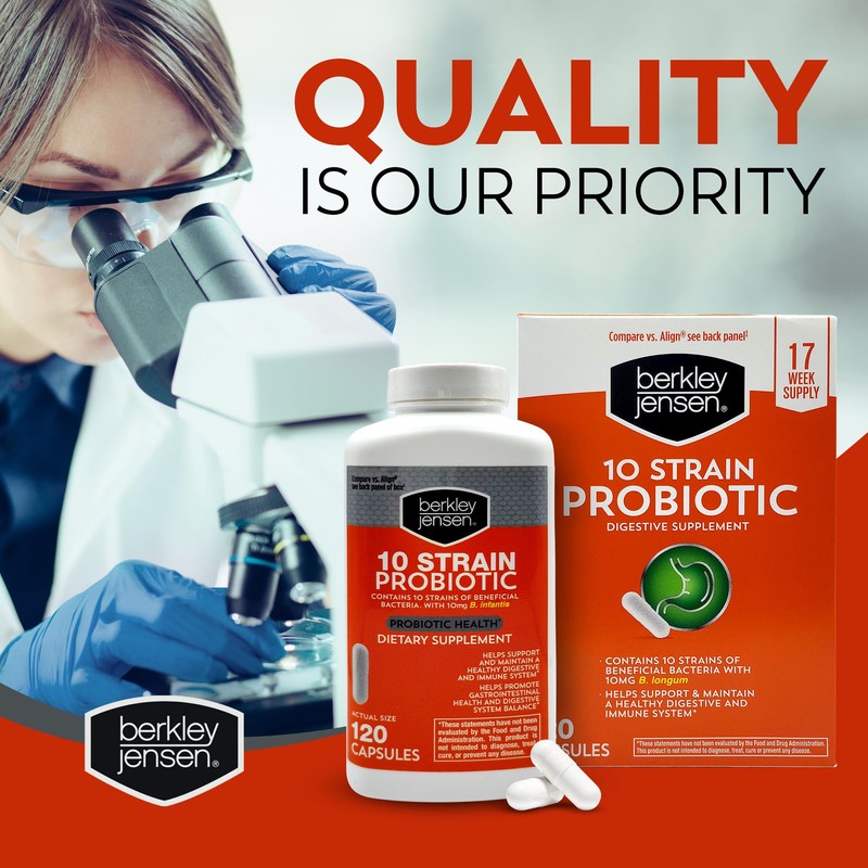 Berkley Jensen Natural 10 Strain Probiotic Supplement Capsules with 10mg B. Longum, Loaded with Live Strains & Beneficial Gut Flora, for Digestive & Immune Health - 17-Week Supply, 120 Ct