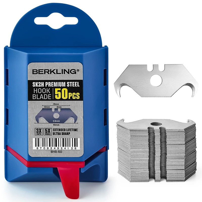Berkling Utility Hook Razor Blades 50-Pack With Dispenser, SK2H Laser Sharpened Hardened, Ultra 3X Sharper and 5X Durable, Heavy Duty Replacement Blades for Carpet, Roofing Blade Knife, Box Cutter