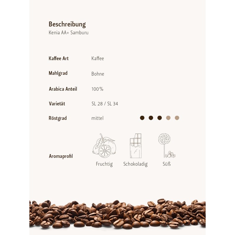 - Inhalt: Berliner Kaffeerösterei - Kenia AA+ Samburu (1000g / ganze Bohne), Röstgrad Kaffee: mittel, 100 % Arabica Bohnen, Aromaprofil: Fruchtig / Schokoladig / Süß