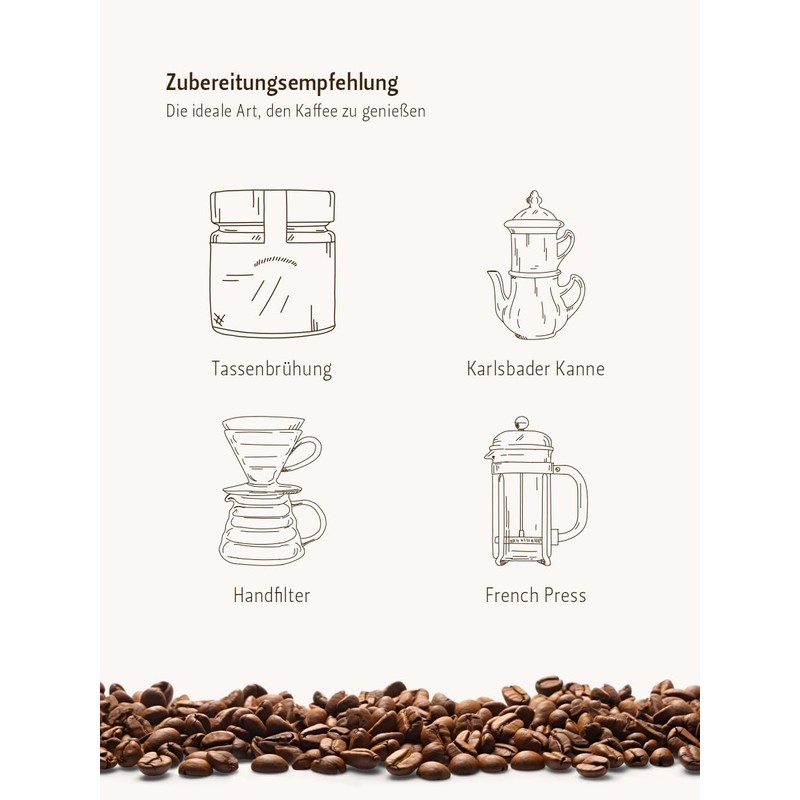 - Zubereitung: Tassenbrühung, Karlsbader Kanne, Handfilter, Cafetiere