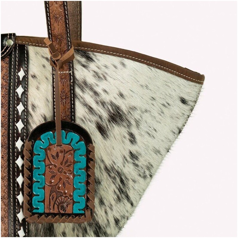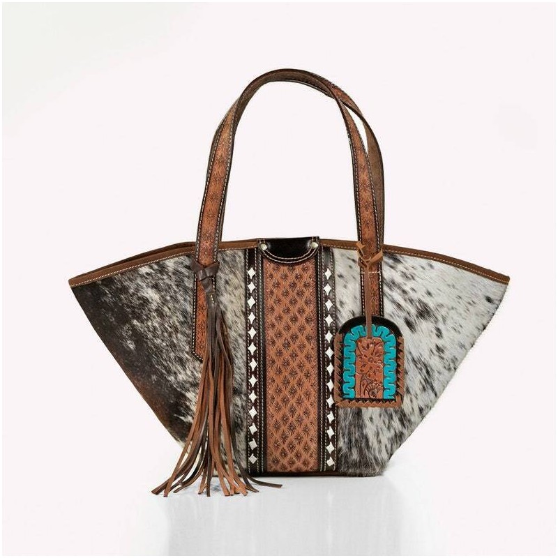 Add a touch of Western elegance to your collection with this beautifully handcrafted leather shoulder tote bag. Designed with intricate hand-tooled details, cowhide inlays, fringe, and turquoise accents, this bag is stylish and functional, making it a perfect accessory for any occasion.