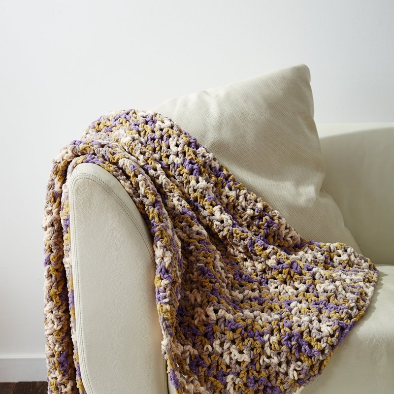 Luxuriously soft and cozy, Bernat Blanket is a chenille-style yarn that’s perfect for home décor projects. From blankets, to crochet baskets, Blanket is ideal for a wide range of projects. It’s super bulky weight stitches up quickly, making it a great choice for afghans and blankets. Available in a wide range of solid and variegate shades to compliment your home décor and in an economical big ball size for larger projects. Conveniently machine washable and dryable.