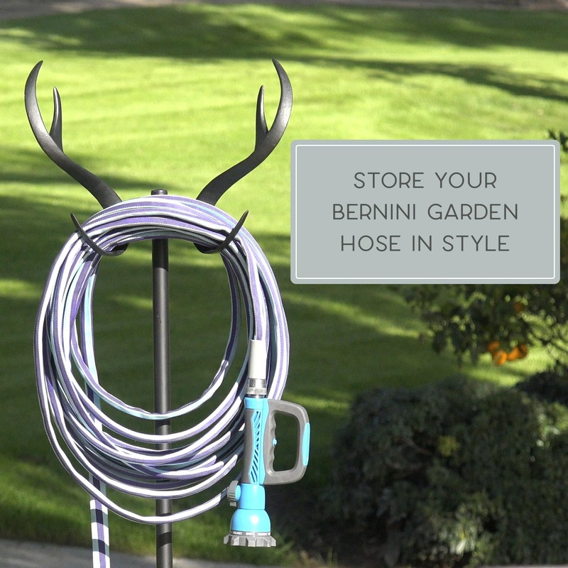 - FREESTANDING HOSE HOLDER: Bernini Antler hose holder is securely planted into the ground via 3 pronged stake. Freestanding garden hose holder holds over 100 ft of garden hose in a nice coil.