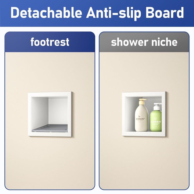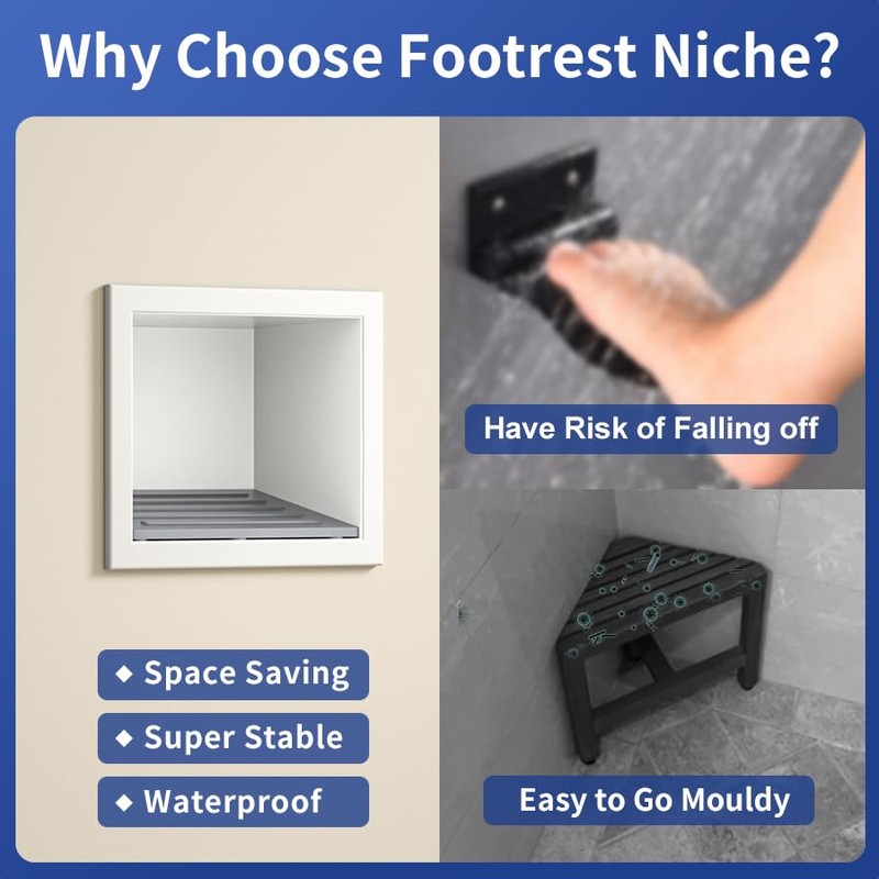 - 【Flexible Height to Choose】Unlike traditional footrest stools, this shower niche footrest allows you to select any height during installation, which helps relieve strain on your back. Moreover, thanks to its recessed design, it is space-efficient.