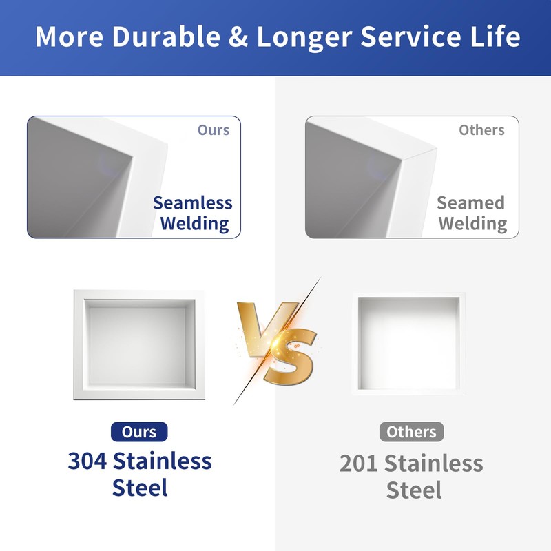 - 【AISI 304 Stainless Steel】Crafted from AISI 304 stainless steel, the Bernkot black shower niche exhibits remarkable resistance to rust and stains. This characteristic renders it an outstanding option for damp and humid settings such as bathrooms. It can endure moisture and preserve its structural integrity for an extended period.