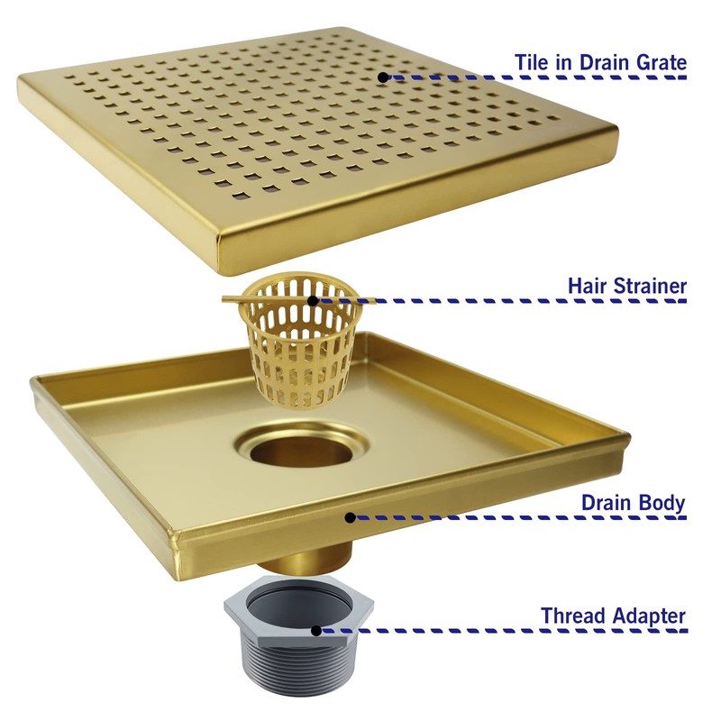 Bernkot Square Shower Drain 8", 304 Stainless Steel Floor Drain with Grid Drain Cover & Hair Strainer, Shower Drain w/CUPC Certified, Brushed Gold