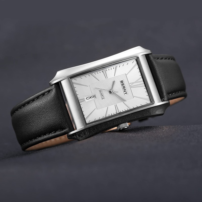 BERNY Mens Business Casual Quartz Watches Stainless Steel Case with Leather Strap Rectangular Watches for Men (White