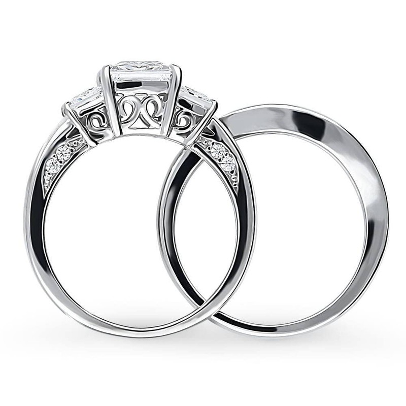 - 925 Sterling Silver: This 3-stone wedding engagement 2 piece ring set is crafted with fine solid sterling silver, stamped 925. Rhodium plated for enhanced durability and tarnish resistance.