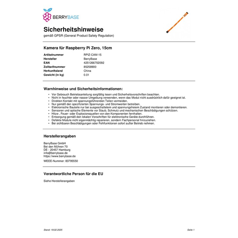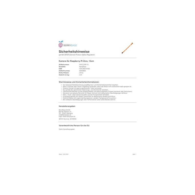 - 【Package Contents】1 x BerryBase 5MP Camera for Raspberry Pi Zero; Flash Shipping within 1-2 working days from Germany.