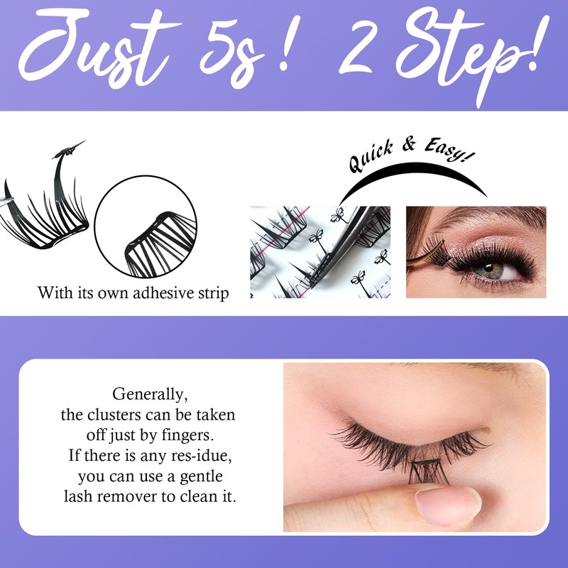 - Easy Application Tips: Gentlely roll the middle of lash down with tweezers; Apply lash bond on your natural eyelashes; Place the lash clusters underneath your lashes