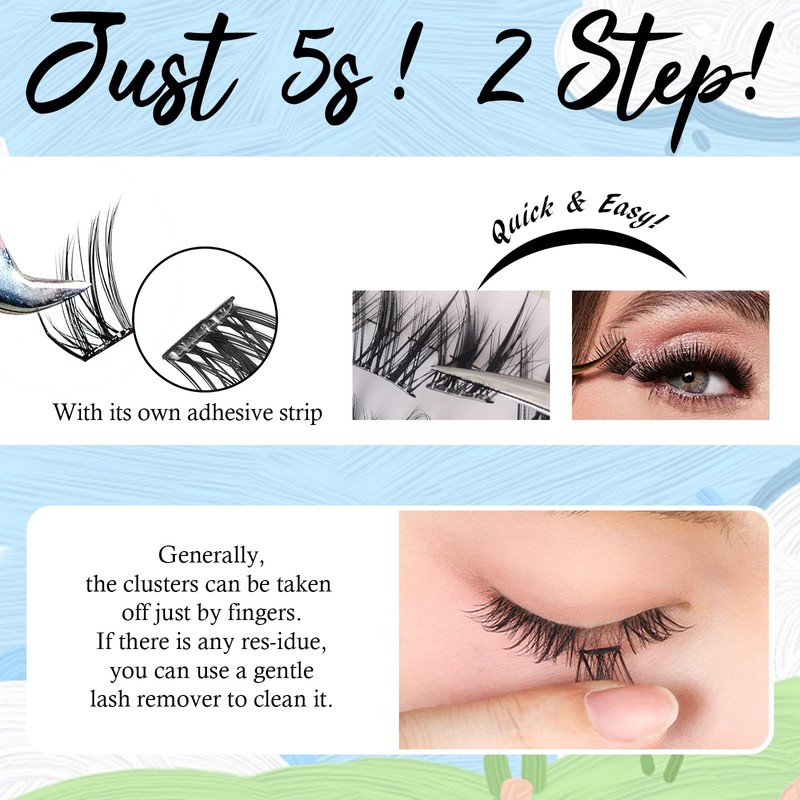 - Long-lasting Effect & Easy to Remove: Update adhesive strip can stick firmly to your natural lashes, don't worry about these pre-glued cluster lashes falling off. Simply peel off the self adhesive lashes with your fingers. No remover, no residue, no irritation for a tidy & fuss-free experience