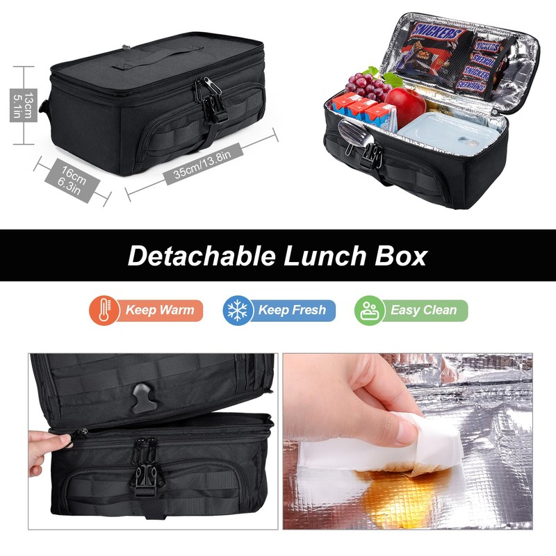 - REMOVABLE COOLER LUNCH BOX: Measuring 13.8*6.3*5.1 inch in dimensions,it will fit max 10pc drinks or 2 food containers; Outside pocket perfet for knife, fork and spoon. With portable top handle, it can also be used as lunch bag.