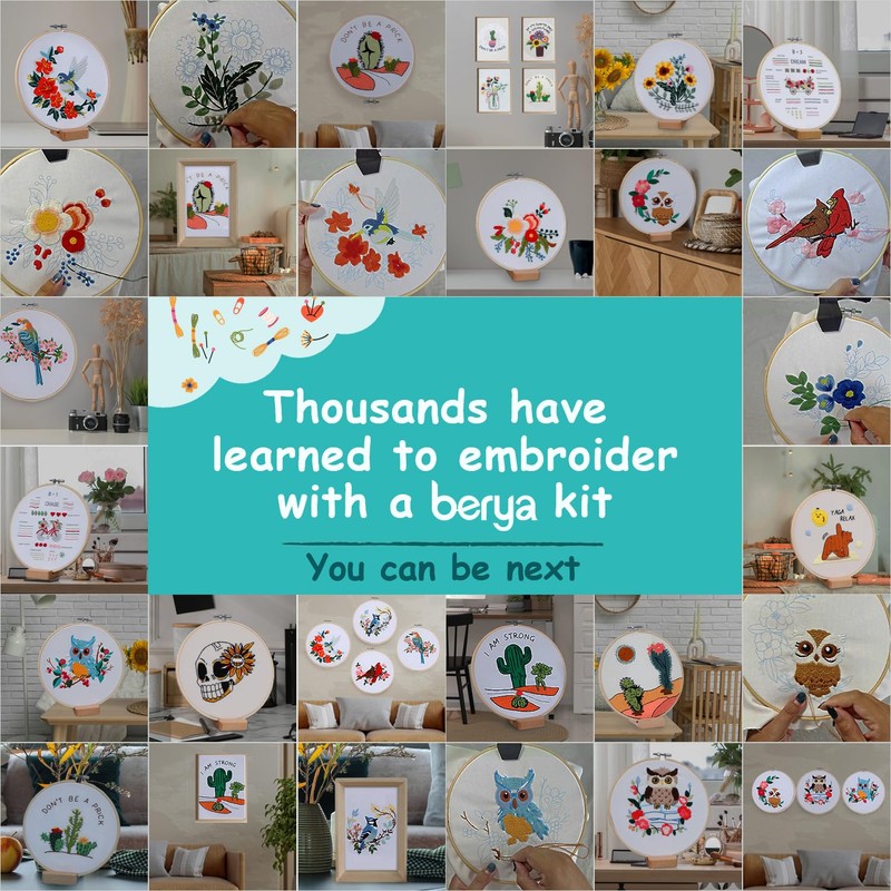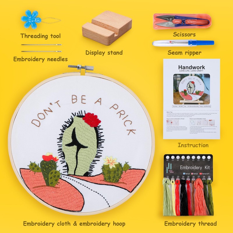 - 【10 Pcs Embroidery Tools】Our embroidery starter kits for beginners includes everything you need: 1pcs 8 inch embroidery hoops, 2pcs embroidery needles, 1pcs embroidery fabric with funny cactus pattern, 1 set of color threads, 1pcs needle threaders, 1pcs seam rippers, 1pcs scissors, 1pcs display stand, 1 pcs embroidery instruction. You can finish a beautiful embroidery just with these kits.
