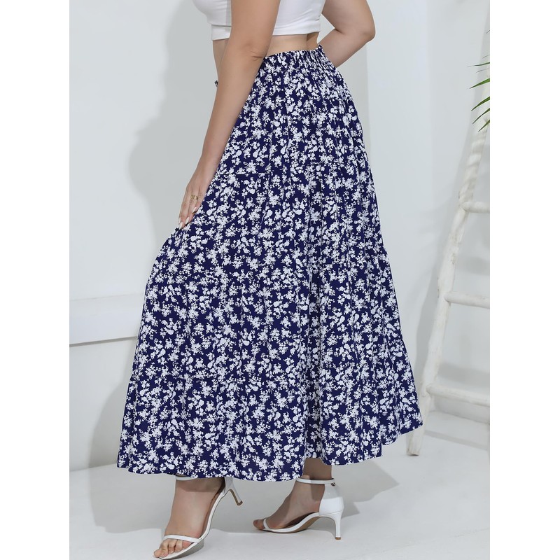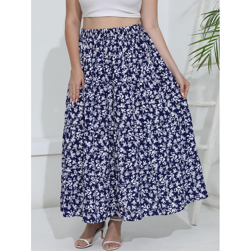 BERYDRESS Women's Casual Maxi Floral Skirts with Deep Pockets Elegant Bohemian Flower Print Flowy Skirt(1XL-C1029-Navy Flo)