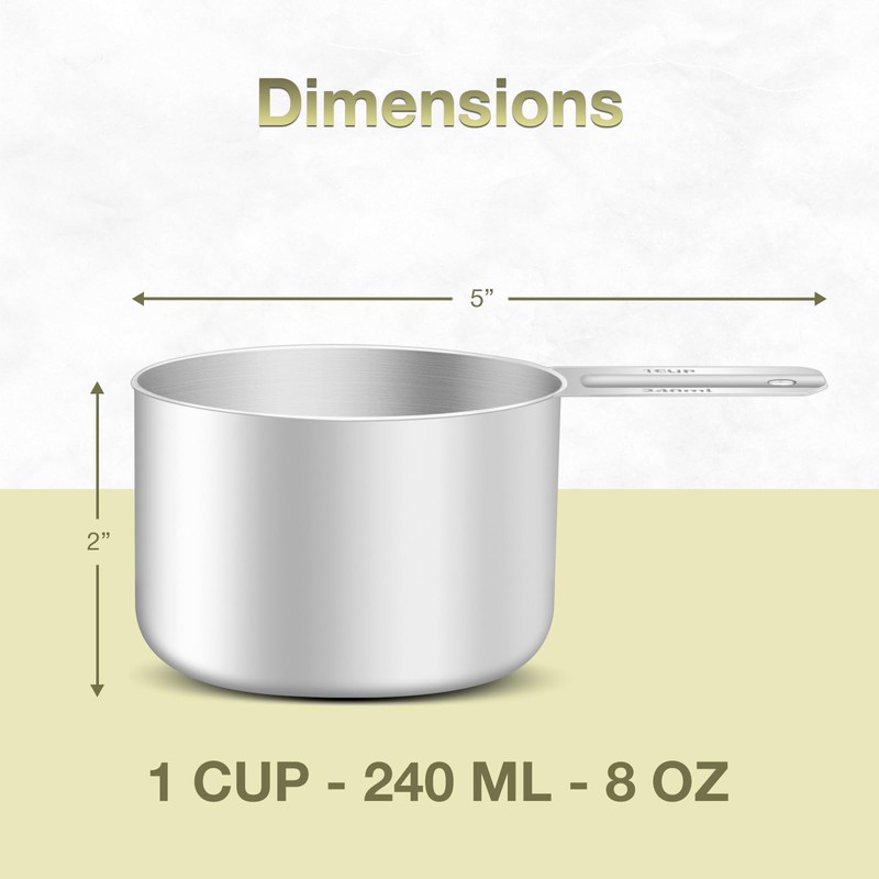 BERYLER 2PCS 1Cup (240ml, 8oz) Single Measuring Cup, Etched Inner Scale Stainless Steel Measure Scoop, Metric and US Measurement, Dishwasher Safe