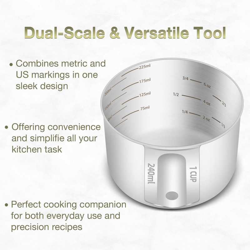 - Dual Scales Available - Engraved clear and accurate METRIC & US scales on the inner side will never fade and can be seen forever. It can meet different needs and let you know the amount to add in every time. The all measurement contains 1cup(8oz), 3/4cup(6oz), 2/3cup, 1/2cup(4oz), 1/3cup, 1/4cup(2oz), 240ml, 225ml, 200ml, 175ml, 150ml, 125ml, 100ml, 75ml, 50ml