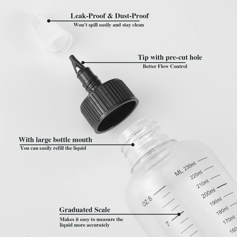 - Graduated Scale for Easy ObservationOur applicator bottle for hair makes it easy to measure the liquid more accurately and measure the liquid ratios for more precise dispensing. Two kinds of scales(oz/ml) are on the transparent bottle body, clear and easy to observe.