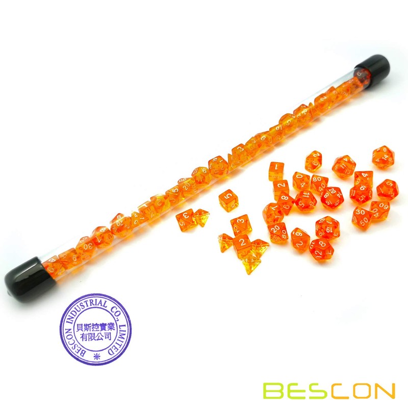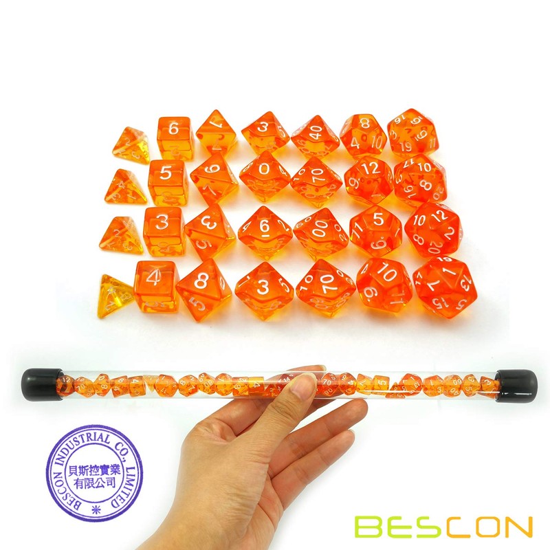 Bescon 28pcs Translucent Orange Mini Polyhedral Dice Set in Tube, Dungeons and Dragons RPG Dice 4X7pcs,Mini Gem Dice Set