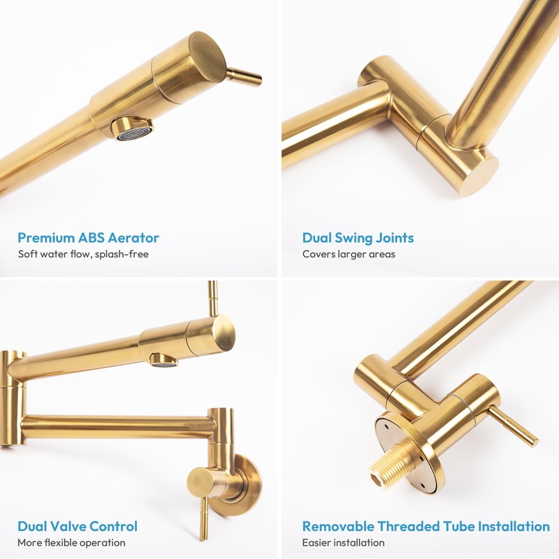 - [Premium Materials] This pot filler kitchen faucet is made of 304 food-grade stainless steel with a brushed gold surface treatment that provides excellent anti-corrosion and anti-rust protection. Equipped with lead-free solid brass cartridge, good sealing and no leakage.