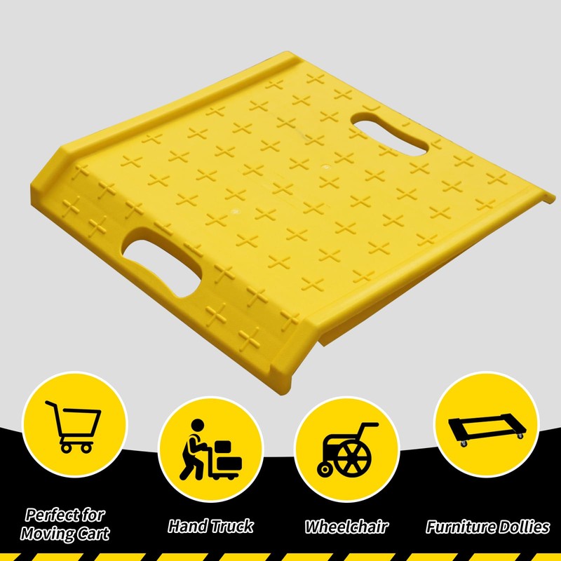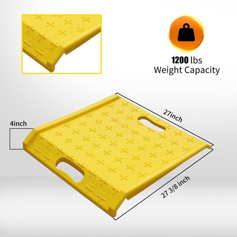 - The Yellow Portable Ramp measures 27.5'' in length, 27'' in width, and 4'' in height (70cm x 68.5cm x 10cm), with a lightweight design of just 9.3 lbs for two pieces. Its larger size provides superior stability and support compared to standard ramps, making it perfect for easy access