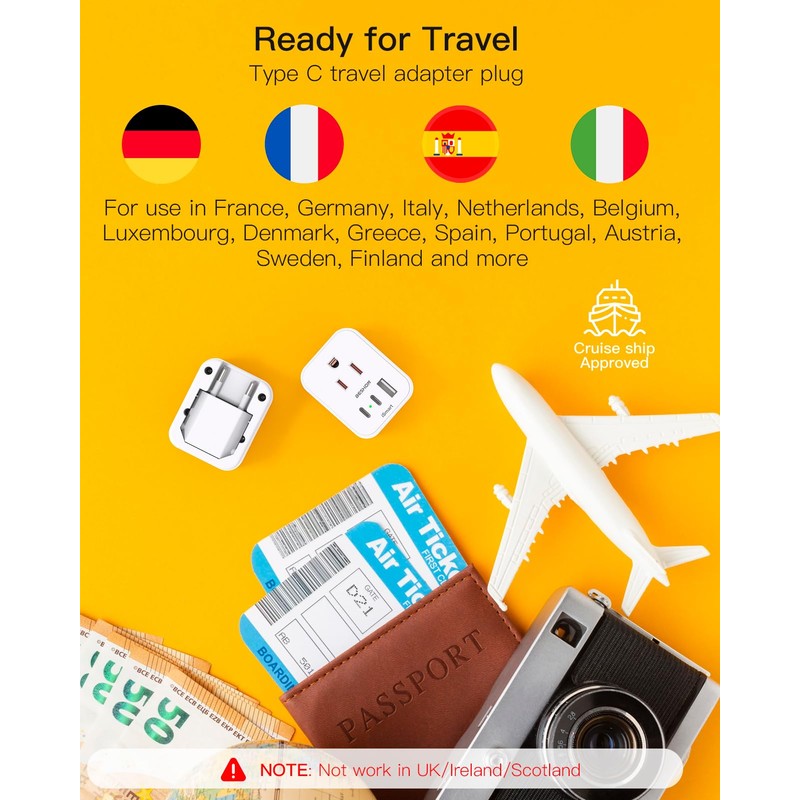 - US to Europe Travel Plug AdapterType C travel adapter plugs for use in European countries such as Italy, Iceland, Greece, France, Iceland, Spain, Portugal, Croatia, Austria, Belarus, Belgium, Denmark, Finland, Germany, Hungary, Poland, Netherlands, Turkey and more. Note: not work in UK/Ireland/Scotland.