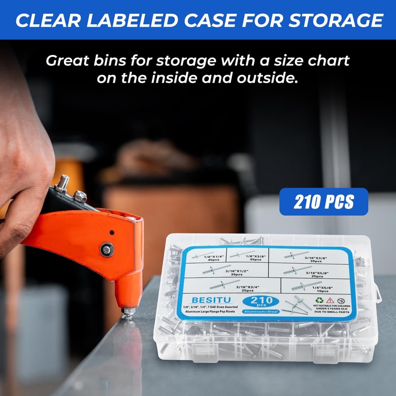 - 【TIME & MONEY SAVER】Great bins for storage with size chart on the inside and outside. Compared to the time it takes to go to a hardware store and the cost of buying single blind rivets, this pop rivets assortment is a time and money saver.