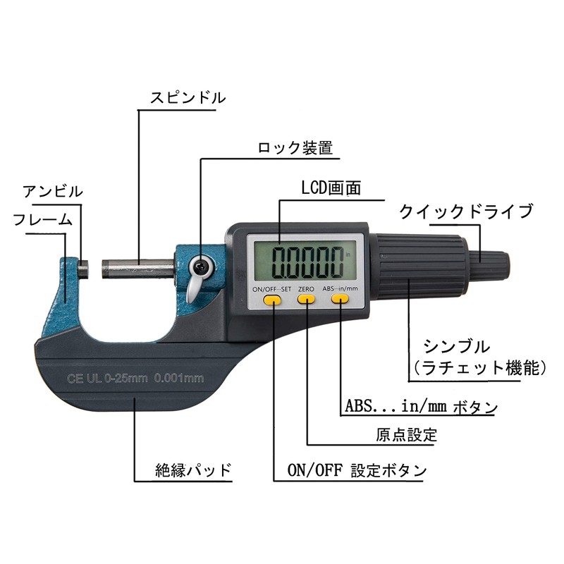 Beslands Digital Micrometer, Thickness Measuring Instrument, 0 - 25 mm, Electronic Microgauge, Micrometer, 0.001 mm LCD Display, Japanese Instruction Manual Included