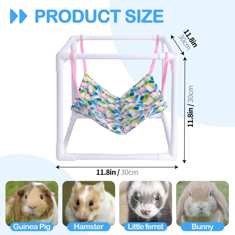 - 【PERFECT SIZE】Stand: 11.81x11.81x11.81 in, Hammock: 10.63x10.63 in. This guinea pig hammock is sized to fit most small pet cages and small snimal playpens. It can be used by both small and adult guinea pigs.