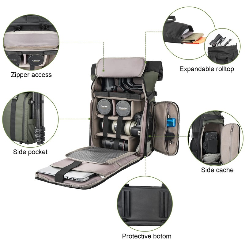 - Professional and Convenient - This is a professional hiking camera backpack for photographers.It consists of main camera compartment , top compartment and rolltop.Convenient Quick side access to your camera, Fully opened on back;Laptop compartment fit 16 inch Macbook Pro notebook computer(Suggest large size:26 x 36 x*1.5 ); quick top zipper access to your other gears.