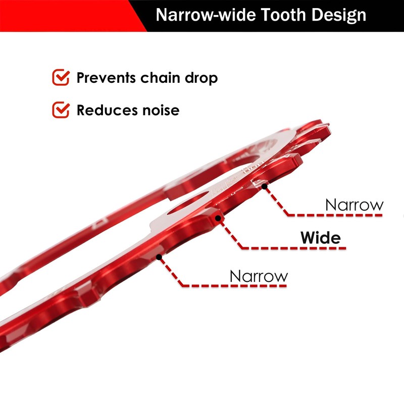 - WIDE NARROW TOOTH DESIGN: The teeth of this round chainring adopt the second generation wide narrow tooth design, which maximises the service life of the chainring and reduces friction and noise. The larger wide-tooth design improves the anti-dropout performance of the chainring