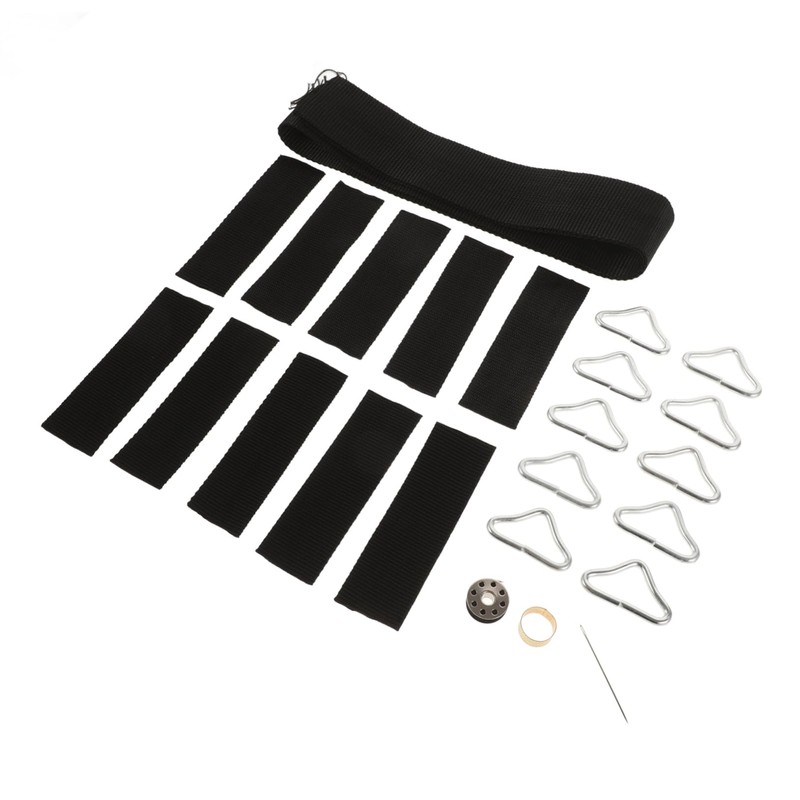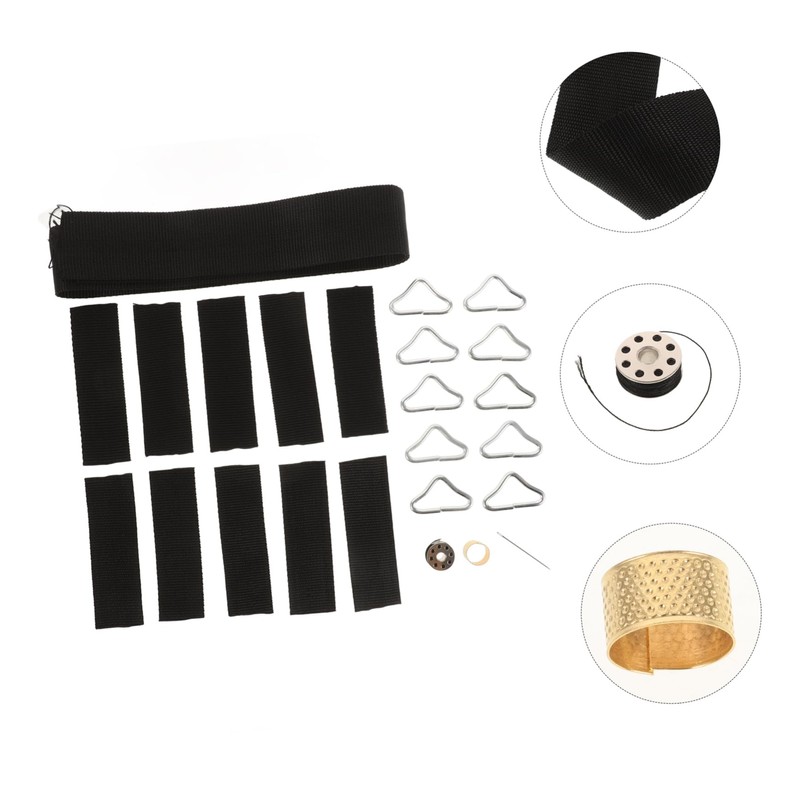 10 x triangle buckles 10 x short webbings 1 x long webbing 1 x thimble 1 x threader 1 x needle 1 x roll of thread