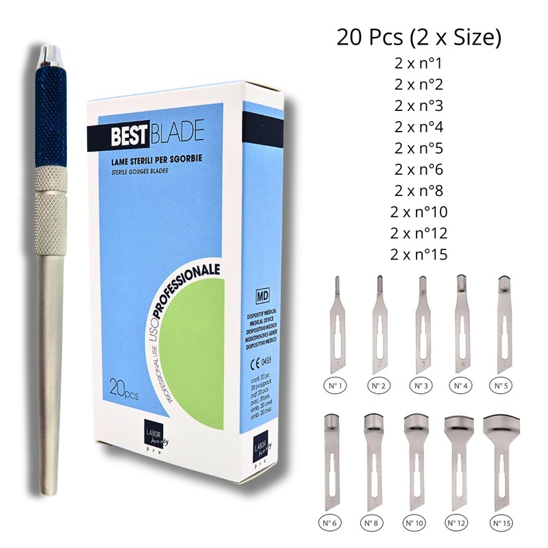 - 🎁 COMPLETE "START PEDICURE" KIT: You will receive 20 different Best Blade knife blades (2 in sizes: 1,2,3,4,5,6,8,10,12,15) with universal aluminum blade holder with screw cap - perfect as a professional pedicure kit.