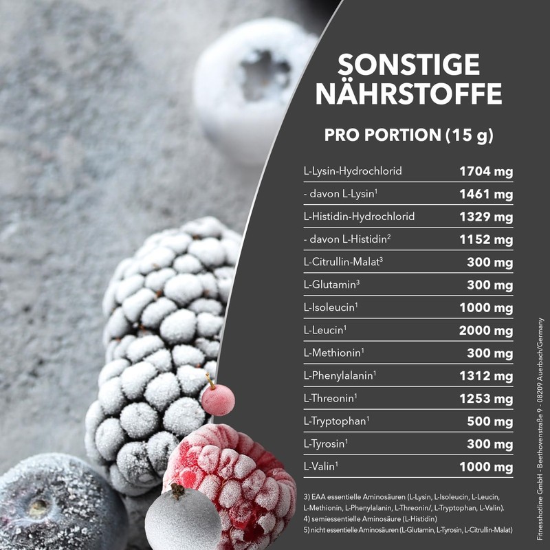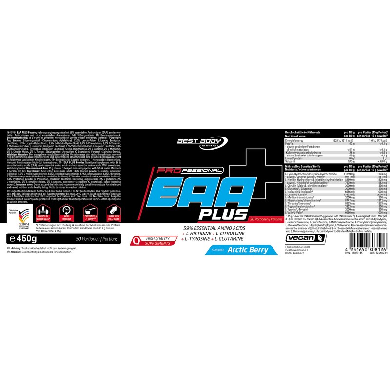 Best Body Nutrition Professional EAA Plus - All 8 Essential Amino Acids + L-Histidine, L-Tyrosine, L-Glutamine and L-Citrulline - Vegan - Arctic Berry - 450 g Tin