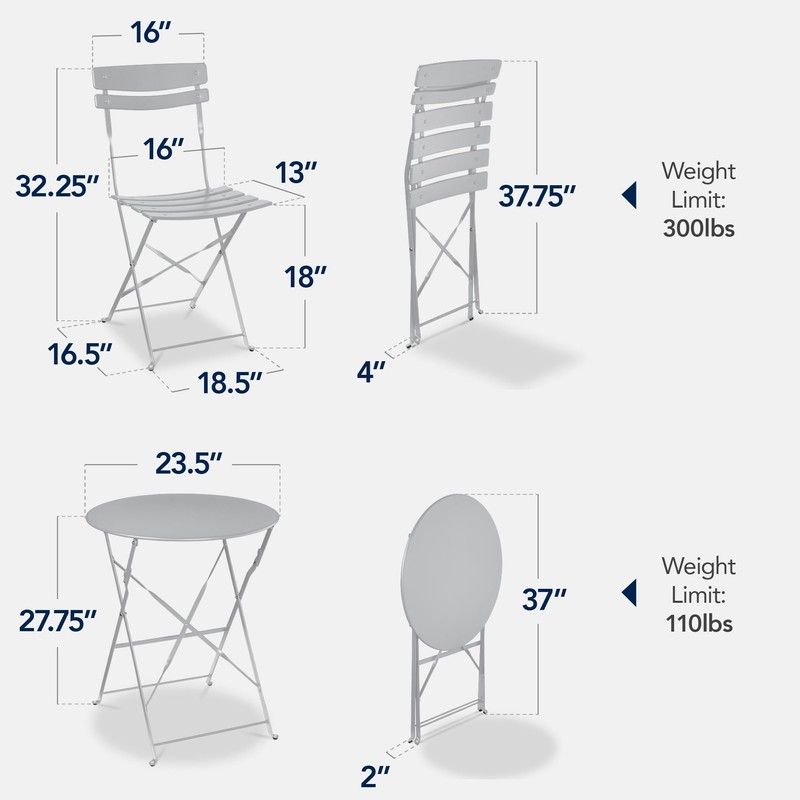 - COMFORTABLE SEATING FOR 2: Designed to comfortably seat two people for cozy meals or casual conversations without taking up too much space; TABLE DIMENSIONS: 23.5"(Dia) x 27.75"(H); CHAIR DIMENSIONS: 18.5"(L) x 16.5"(W) x 32.25"(H); TABLE CAPACITY: 110 lbs.; CHAIR CAPACITY: 300 lbs.
