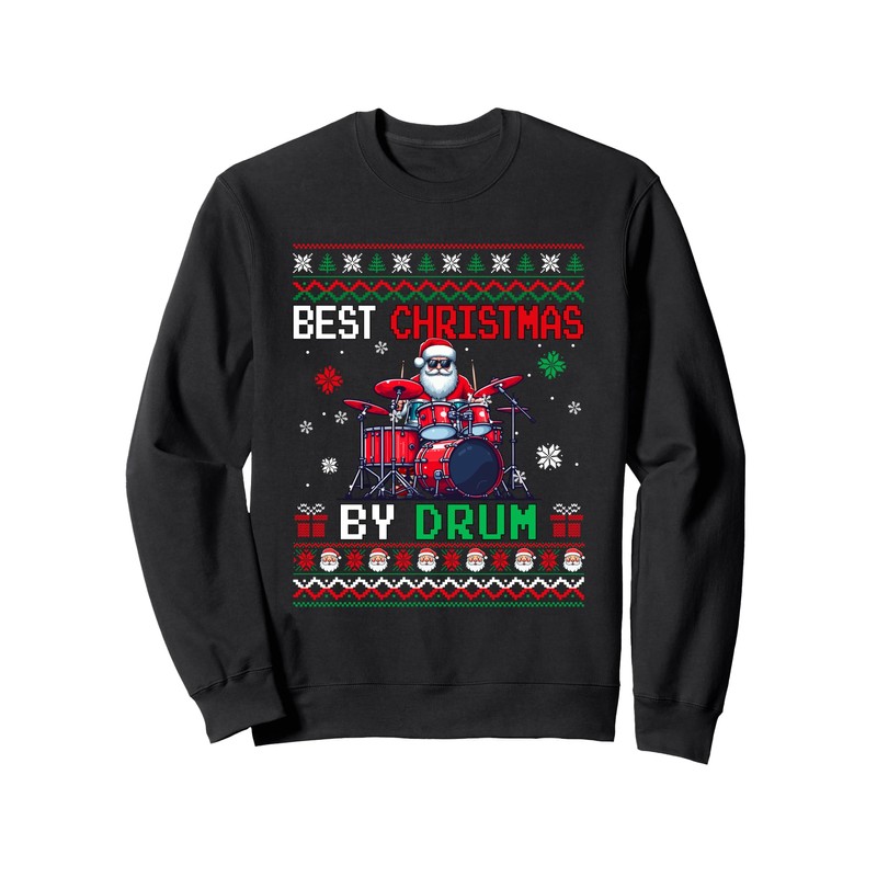 Best Christmas By Drum Sweater Santa Playing Drum Drummer Sweatshirt, black