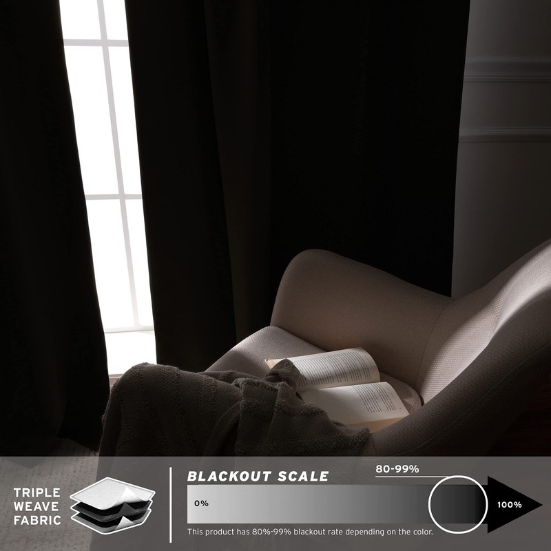 - BLACKOUT AND THERMAL INSULATED: Features an innovative triple weave fabric construction to block out sunlight and harmful UV rays. Laboratory-tested innovative super dense fabric insulates against the heat and cold, saving you money & energy. Effectively blocks 80%-99% of sunlight and 100% of UV rays. Helps mute outside noise creating a calm and peaceful environment. The window panels can be used in living rooms, bedrooms, guest rooms, theaters, and other rooms with high ceilings.
