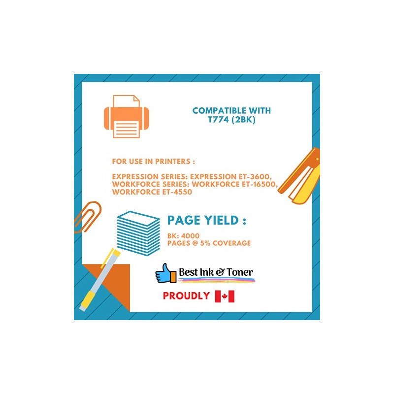 Best Ink Compatible Ink Bottle Replacements for 774 (2 Black) T774 for use in Expression ET-3600, Workforce Series ET-16500,ET-4550 (Black Upto 7000 Pages) (2 Pack Black)
