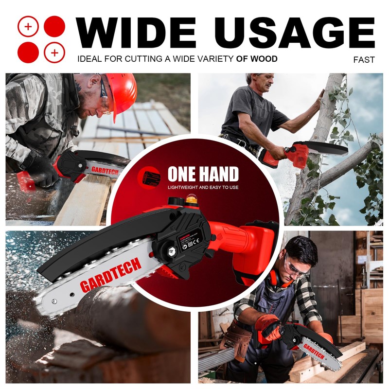 - 🎁 【PERFECT GIFT CHOICE】6 Inch Mini Chainsaw Cordless weighs only 2.6 lbs that can be used to cut tree trunks, divide wood blocks, and complete DIY work on wood. Gardtech Mini Chainsaw with gift packaging is the best choice as a gift given for Husbands, Dads, Moms, DIYers, and Friends.