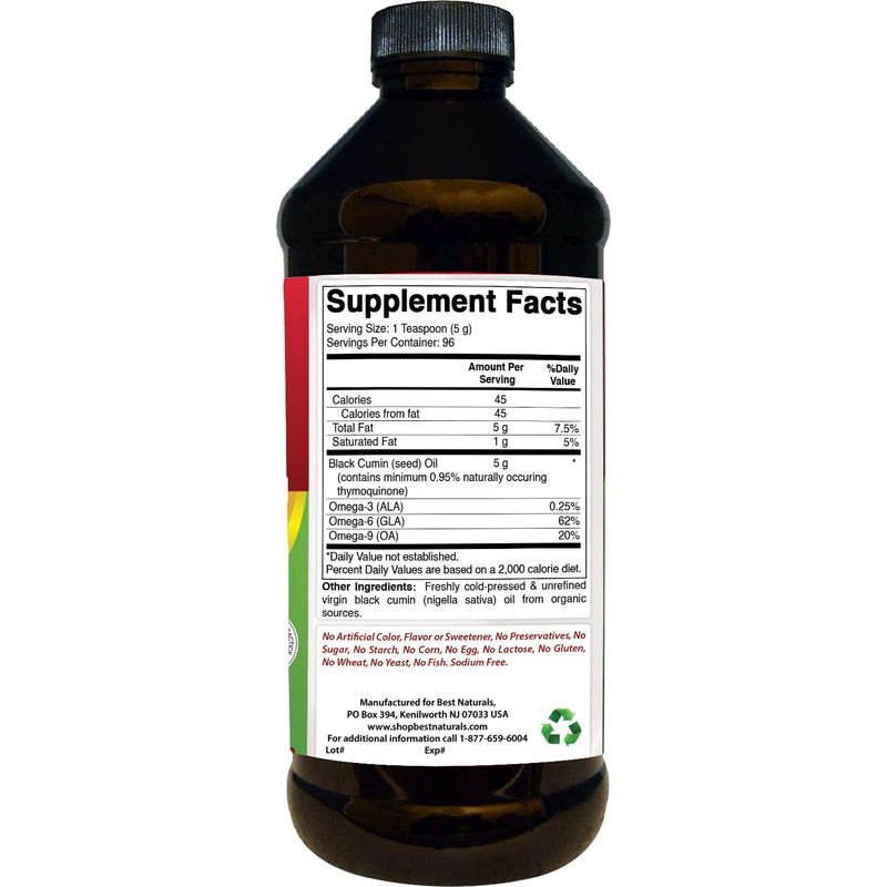 Best Naturals Best Naturals Black Seed Oil - Minimum 0.95% Thymoquinone (TQ) - Cold Pressed Nigella Sativa Aids in Digestive Health, Immune Support, Brain Function, Joint Mobility, Gluten Free, Non GMO - 16 OZ