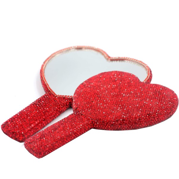 Bestbling - Espejo de mano con forma de corazón con diamantes de imitación, portátil y deslumbrante para retoques sobre la marcha (plástico rojo)