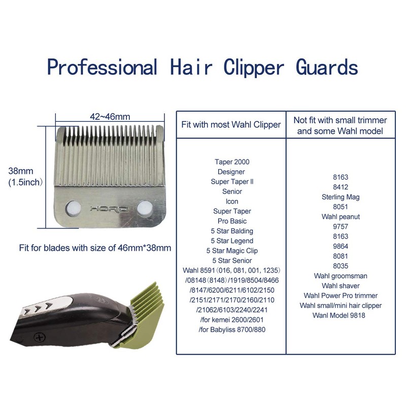 - ✂✂ Easy Fit Guide Combs The clipper's replacement cutting guides lock securely to the blade to ensure a reliable fit when trimming. Each comb is designed to glide through hair quickly and efficiently for a smooth, time-saving finish. Fits Size 45.5mm x 38.5mm
