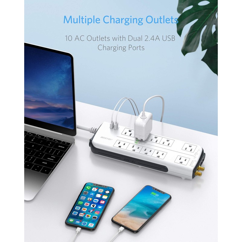 - Protector de sobretensiones de 10 enchufes con alta capacidad de protección contra sobretensiones de 4000 julio, protege todo tu hogar, oficina y electrodomésticos de cocina enchufables como TV, altavoces, DVD, computadora, computadora portátil, impresora, módem, lámpara, refrigerador, sistema de cine en casa de daños por sobretensión; puertos de carga USB duales con tecnología IC inteligente identifica automáticamente tu dispositivo y consigue que se carga más rápido a una velocidad de hasta 2.4 A. 5 V/2.4 A máximo cada puerto.