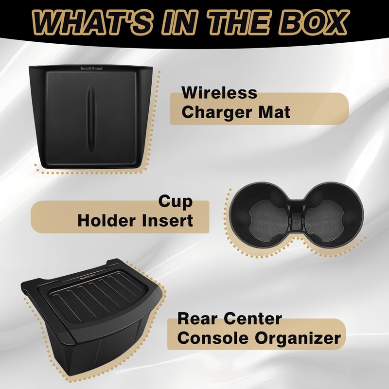 BestEvMod for 2026+ Model Y Juniper Refresh 3PCS Console Essentials Bundle Trash Can Backseat Storage Box Garbage Rear Bin Can Rear Center Console Organizer & Wireless Charger Mat & Cup Holder Insert
