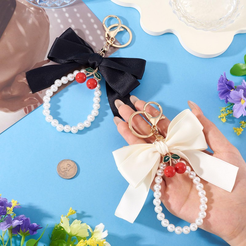 Bestewelry 2 Pcs Cherry Keychains Black White Polyester Bowknot Keychains Imitation Pearl Accessories with Golden Alloy Clasps for Bag Purse Strap Keyring Women Gifts