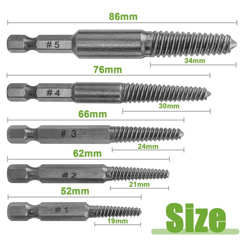 • Completely Set - Including #1, #2, #3, #4, #5 spiral screw extractors, suitable for various types of screws and bolts and meet your different needs when operating.