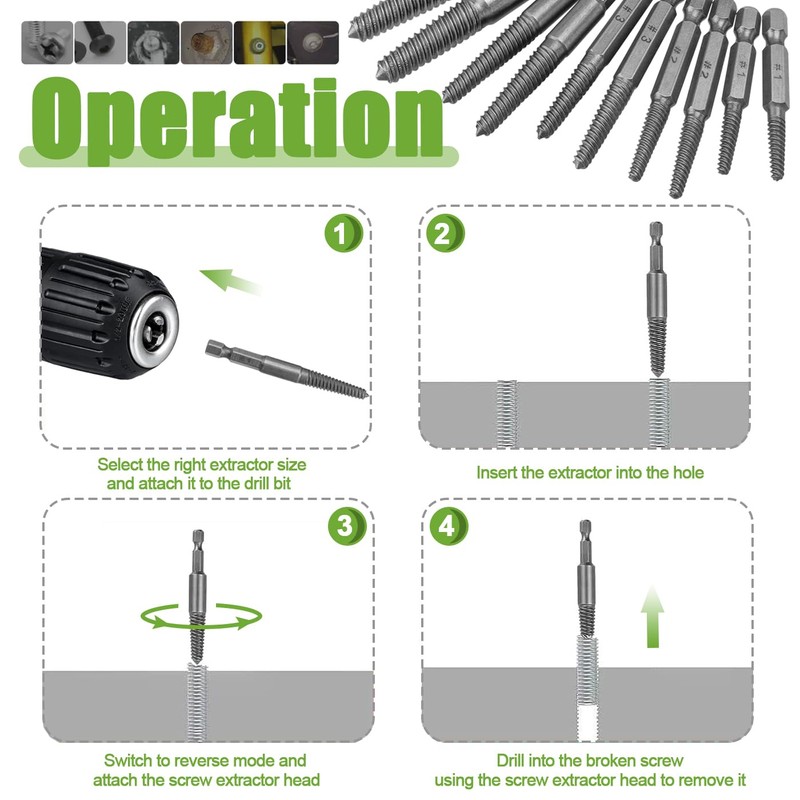 • Simple Operation - Before taking the broken screw, drill the hole with the drill bit and then take out the screw easily. Damaged screw removers are suitable for various machinery repair work.