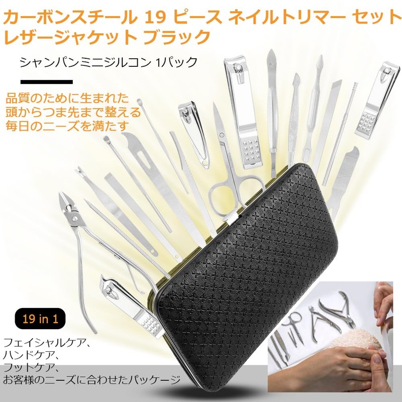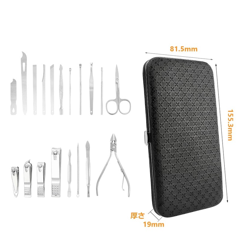 <p>Bestgle 19 ピース ステンレススチール製プロ仕様の爪切り 美容マニキュアセット - レザーケース + シャンパン ミニジルコン 1 パック、自宅や旅行に必須のアイテム。</p><p>- 驚きをお届けします: 爪切りセットだけでなく、爪を整えた後にマニキュアをするときに使えるネイルダイヤモンドアクセサリーも厳選してご用意しています。</p><p><br></p><p><strong>▶仕様</strong></p><p>材質: ステンレス</p><p>梱包材:PUレザー</p><p>パッケージ長さ: 155.3mm</p><p>梱包幅:81.5mm</p><p>梱包厚さ:19mm</p><p><br></p><p><strong>▶特徴</strong></p><p><strong>-19点セット</strong></p><p>爪切りバサミ、爪やすり、耳かき、眉毛カットバサミなど19種類のプロ仕様のツールが付属しており、自宅、美容院、ネイルサロンでの使用に適しています。ネイルアート愛好家にとって理想的な選択肢です。</p><p><br></p><p><strong>-優れた品質</strong></p><p>ネイルセットはステンレススチール素材で作られており、耐久性があり錆びにくく、鋭い刃で爪や角質を簡単に切り取ることができます。</p><p><br></p><p><strong>-ポータブルデザイン</strong></p><p>セットにはツールの配置に便利なPUレザーケースが付属しており、スイッチを押すだけで簡単に開くことができます。完璧なサイズと軽量で、旅行に持ち運びやすいです。</p><p><br></p><p><strong>-多機能</strong></p><p>高品質のネイルキットは、手、足、顔のケアに最適で、日常のニーズを満たし、友人や家族への心のこもった贈り物になります。</p><p><br></p><p>▶<strong>親切なヒント</strong></p><p>- 爪切りキットは非常に鋭利ですので、ご使用の際はご注意ください。</p><p>-お子様だけで使用しないでください。傷がつかないよう、使用後はきちんと保管してください。</p><p><br></p><p><strong>▶パッケージ内容</strong></p><p>19点のマニキュアセット</p><p>ダイヤモンドネイルデコレーションアクセサリーパック</p>